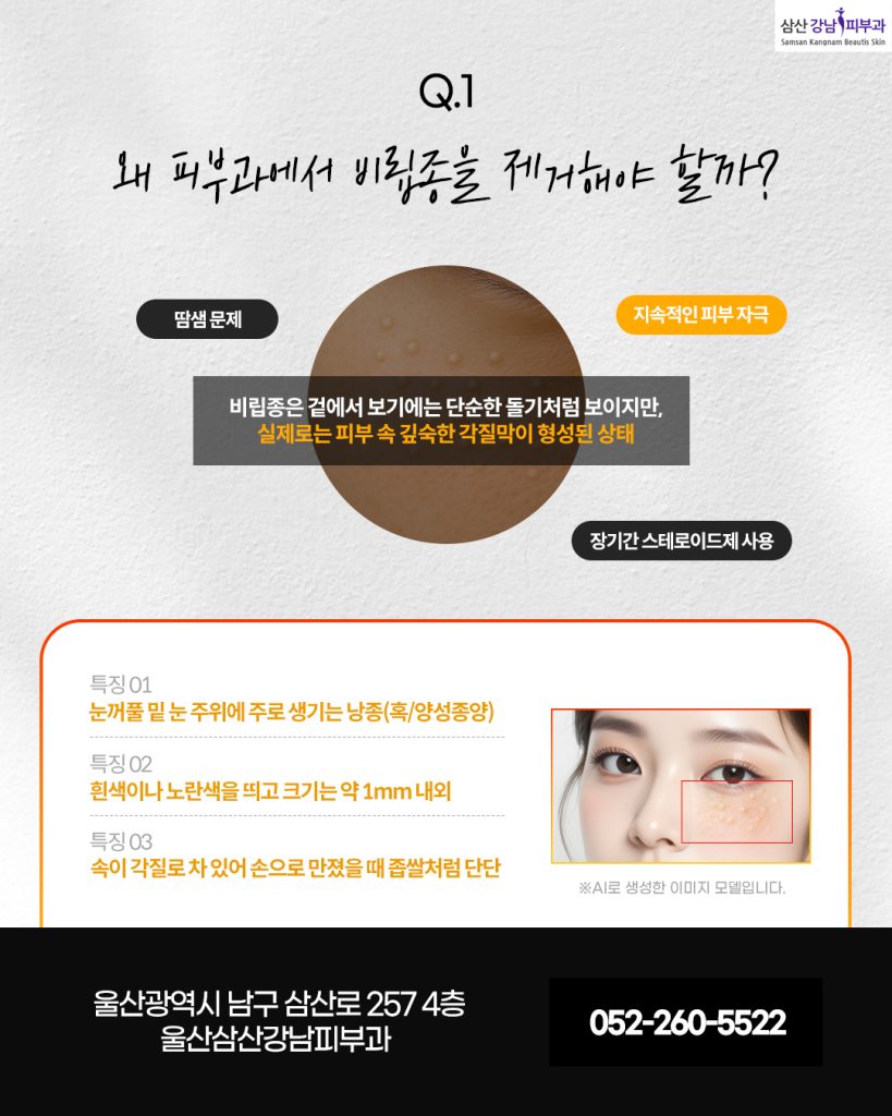 비립종은 생명에 지장을 주는 질환은 아니지만, 시간이 지나면서 개수가 늘어나거나 한관종처럼 주변으로 확산될 수 있습니다. 특히 눈가처럼 얇은 피부는 재생력이 떨어지기 때문에 잘못된 자가 울산비립종제거 압출로 인한 흉터가 남기 쉽습니다.