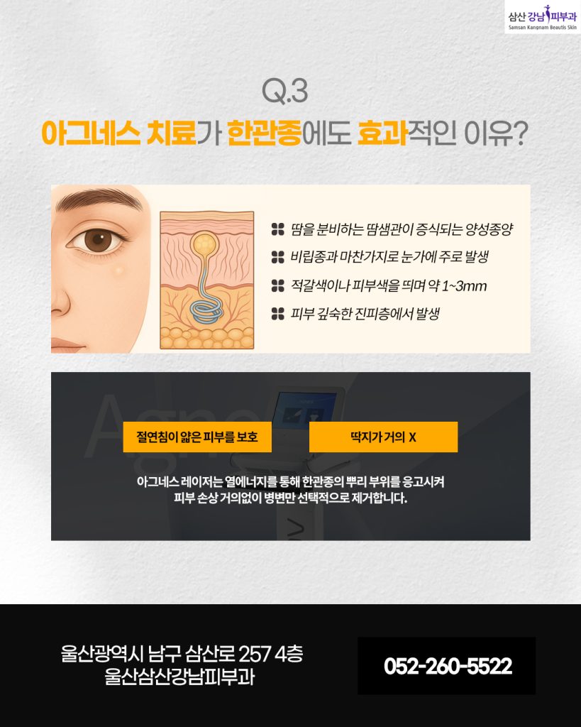 울산비립종제거 아그네스 레이저는 열에너지를 통해 한관종의 뿌리 부위를 응고시켜 피부 손상 없이 병변만 선택적으로 제거합니다. 절연침의 절연길이가 짧아 얇은 피부를 보호하며, 딱지가 거의 생기지 않아 다음날 세안이나 화장도 가능합니다.