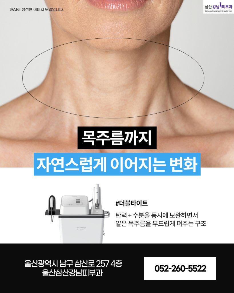 울산삼산더블타이트는 얇고 건조해지기 쉬운 목 피부에도 콜라겐 재생과 수분 환경 개선이 동시에 작용하기 때문에 잔주름 중심의 목주름에서는 부담 없이 자연스러운 변화를 기대할 수 있습니다.