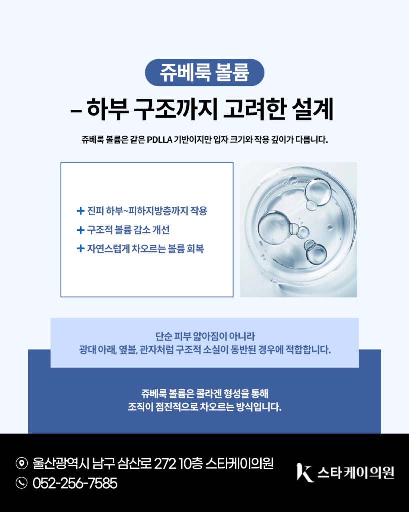 울산삼산동쥬베룩 볼륨은 같은 PDLLA 기반이지만 입자 크기와 작용 깊이가 다릅니다.