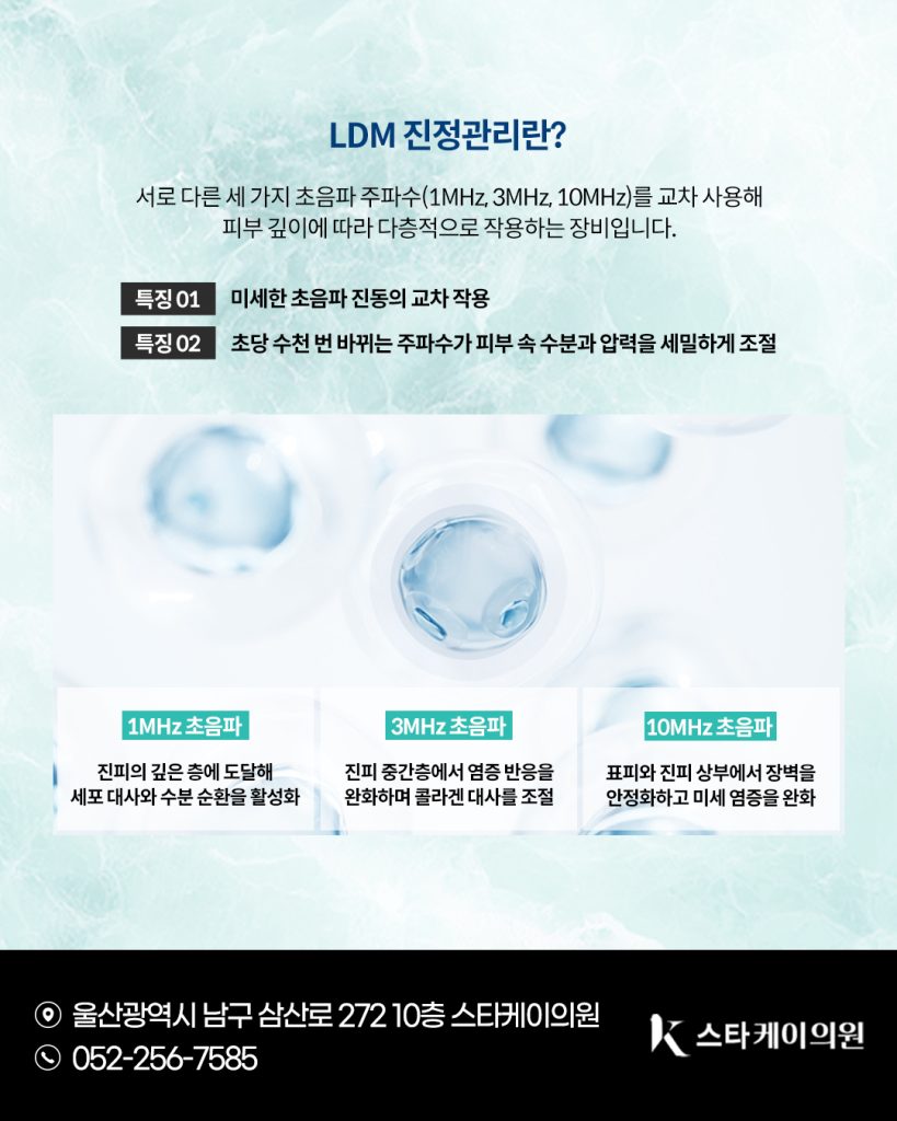 울산삼산동피부과 LDM의 고주파 초음파(10MHz)는 이 미세한 염증 부위에 작용해 혈관 반응을 안정시키고 자극에 대한 과민 반응을 완화시킵니다.