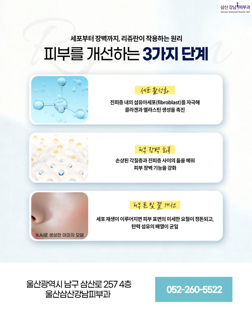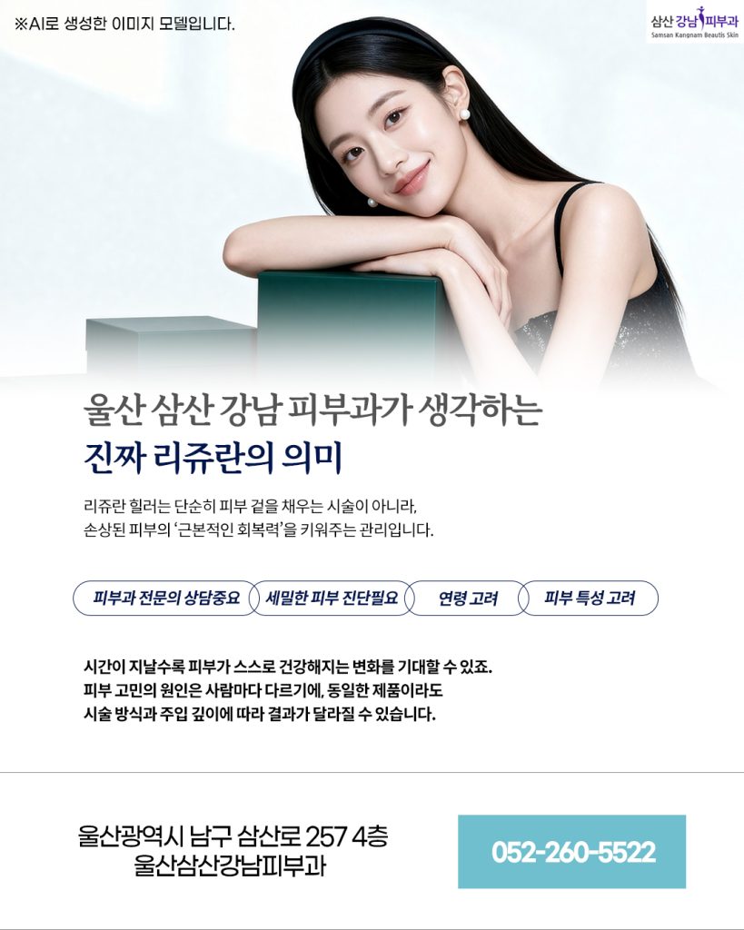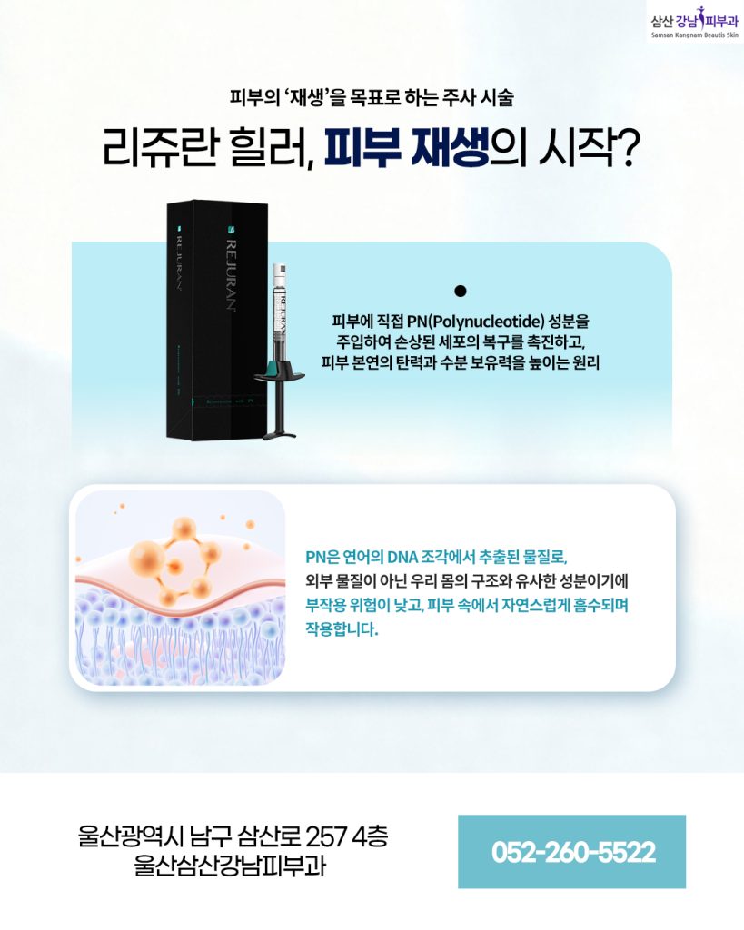 울산 삼산 강남 피부과에서는 피부과 전문의의 세밀한 진단을 바탕으로, 연령과 피부 특성에 맞는 리쥬란 힐러 시술을 통해 보다 자연스럽고 건강한 피부 회복을 도와드리고 있습니다.
