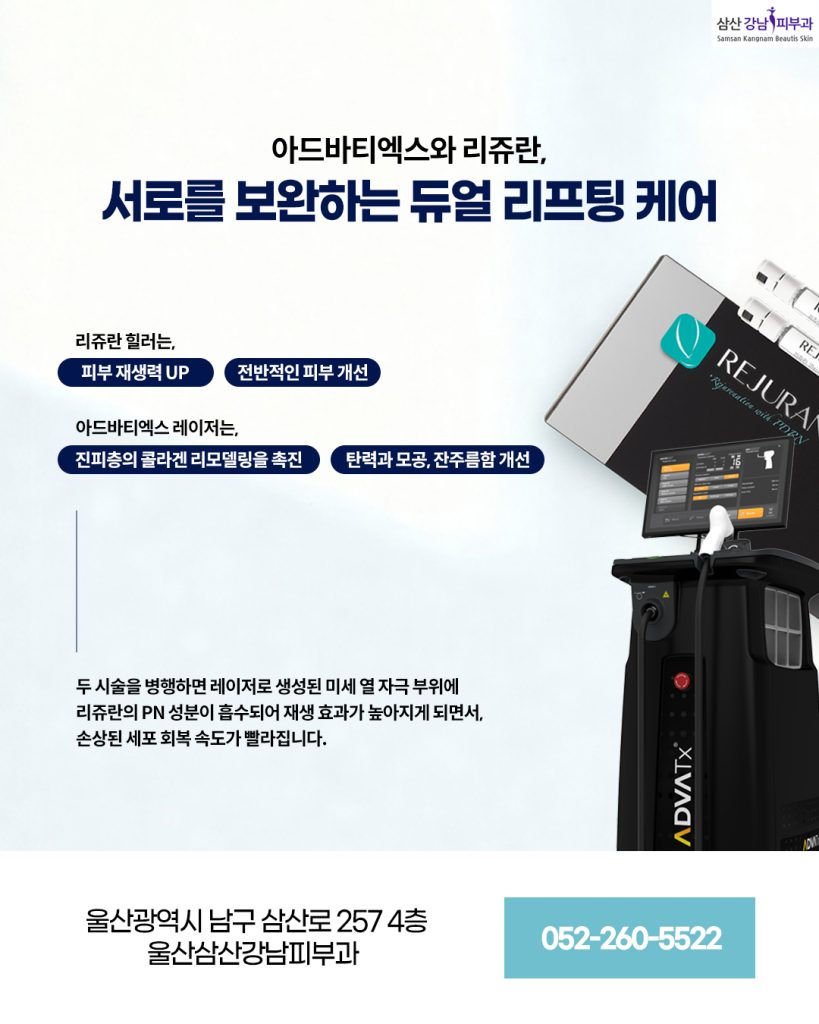 울산삼산동피부과는 피부의 재생력을 높이고, 아드바티엑스 레이저는 진피층의 콜라겐 리모델링을 촉진해 탄력과 모공, 잔주름을 함께 개선합니다. 두 시술을 병행하면 레이저로 생성된 미세 열 자극 부위에 리쥬란의 PN 성분이 흡수되어 재생 효과가 높아지게 되면서, 손상된 세포 회복 속도가 빨라집니다.