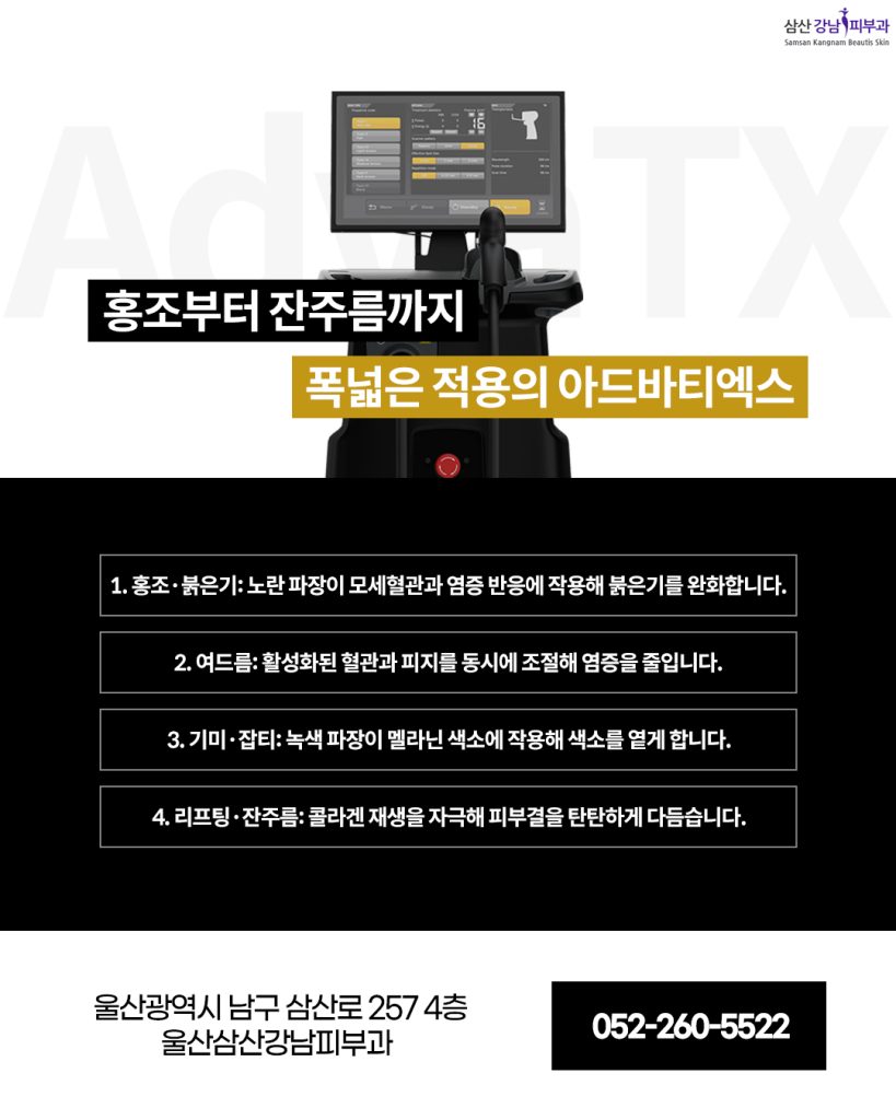 아드바티엑스는 노란 파장과 녹색 파장을 결합한 듀얼 레이저 장비로, 한 번의 울산삼산피부관리 시술로 여러 피부 문제를 동시에 관리할 수 있는 것이 특징입니다.