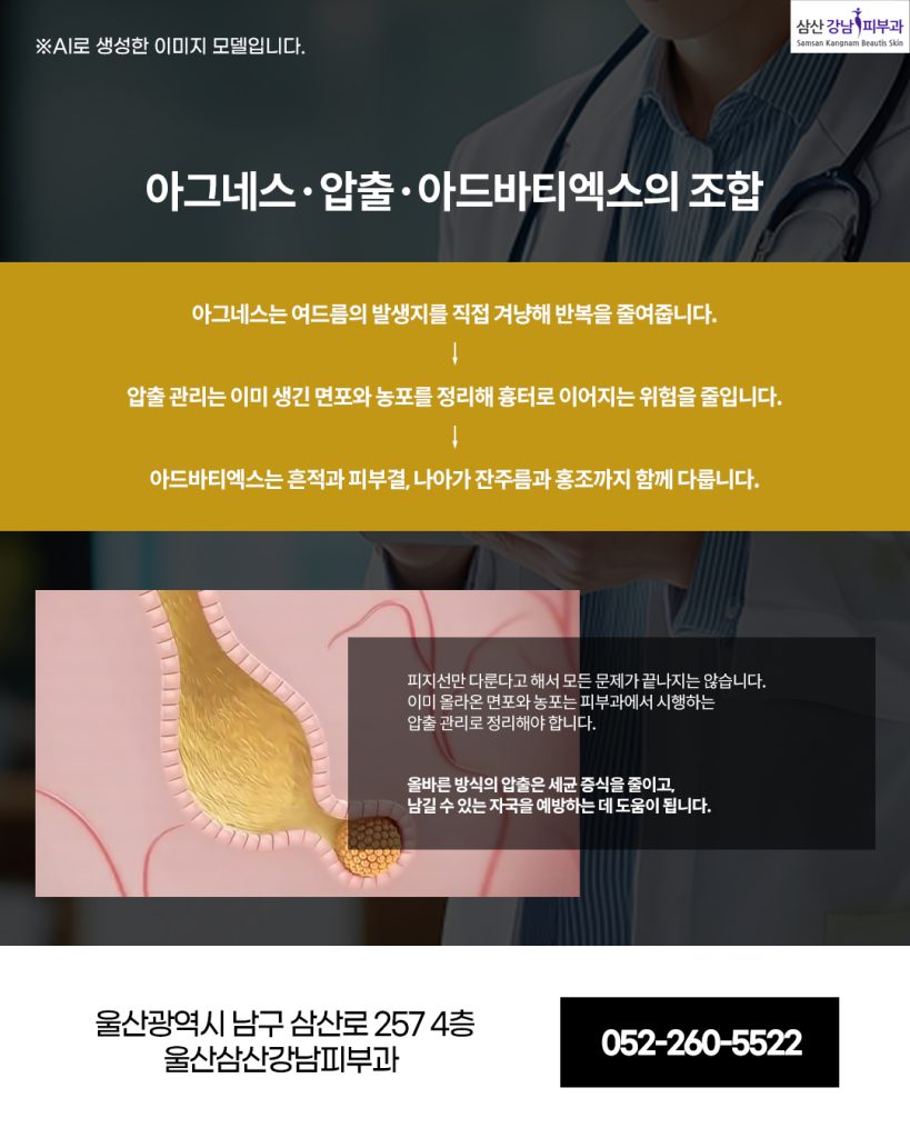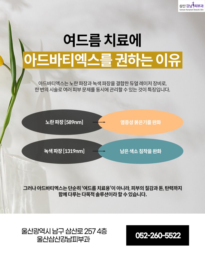이 울산삼산피부관리 세 가지가 연결되면 단순히 여드름 치료를 넘어 피부 전체의 컨디션이 개선되는 흐름을 만드는 데 도움이 됩니다. 특히 아드바티엑스는 여드름뿐 아니라, 색소·홍조·리프팅까지 아우르기 때문에 울산삼산피부관리 시술 조합의 범위를 넓혀줍니다.