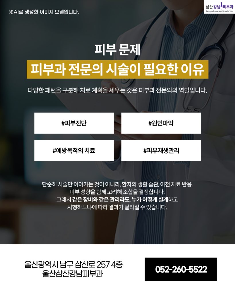 피부과를 다녀도 여드름이 반복되거나, 붉은 자국과 기미·잡티가 남아 만족스럽지 않았던 경험이 있으실 겁니다. 거울을 볼 때마다 울긋불긋한 흔적, 쉽게 가려지지 않는 색소, 점점 늘어나는 잔주름은 단순 울산삼산피부관리만으로는 해결이 어렵습니다. 피부 문제는 대개 하나만 존재하지 않고 서로 얽혀 나타나기 때문에, 한 가지 방법만으로는 부족한 경우가 많습니다.