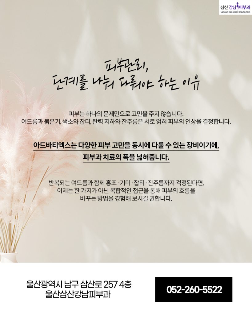 특히 아드바티엑스는 다양한 피부 고민을 동시에 다룰 수 있는 장비이기에, 피부과 치료의 폭을 넓혀줍니다. 반복되는 여드름과 함께 홍조·기미·잡티·잔주름까지 걱정된다면, 이제는 한 가지가 아닌 복합적인 접근을 통해 피부의 흐름을 바꾸는 울산삼산피부관리 방법을 고려할 수 있습니다.