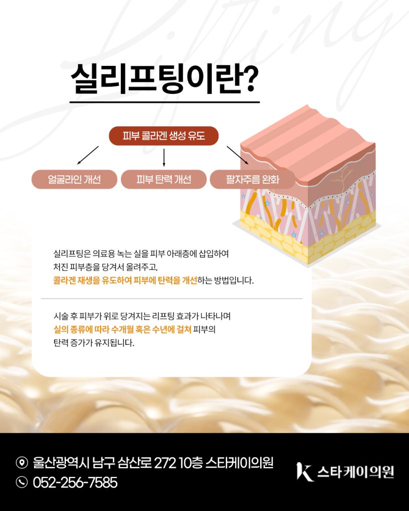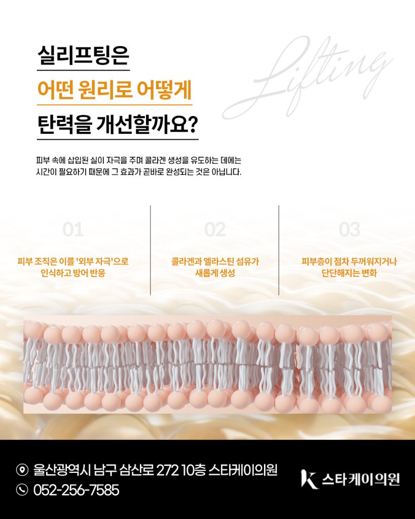울산실리프팅은 특수 의료용 실을 피부 속에 삽입해 처진 조직을 당겨 올리는 시술입니다. 실은 일정 기간이 지나면 체내에서 자연스럽게 녹아 없어지는데, 그 과정에서 콜라겐과 엘라스틴 재생을 촉진하여 피부 탄력을 높입니다.