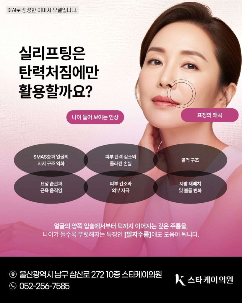 울산실리프팅은 턱선과 볼 부위를 직접 당겨 올려 흐려진 윤곽을 개선하는 데 주로 활용됩니다.