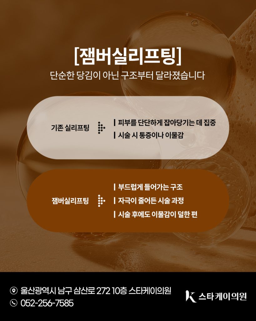 그중에서도 울산잼버실 리프팅은 기존 캐번실의 구조를 보완해 개발된 방식으로 단순한 물리적 당김을 넘어 피부 조직과의 조화를 고려한 것이 특징입니다.