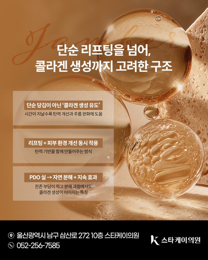 삽입된 울산잼버실이 피부 조직과 점차 유착되는 과정에서 콜라겐 생성을 자극하게 되며, 시간이 지남에 따라 피부 탄력 개선과 주름 완화 효과를 기대할 수 있습니다.