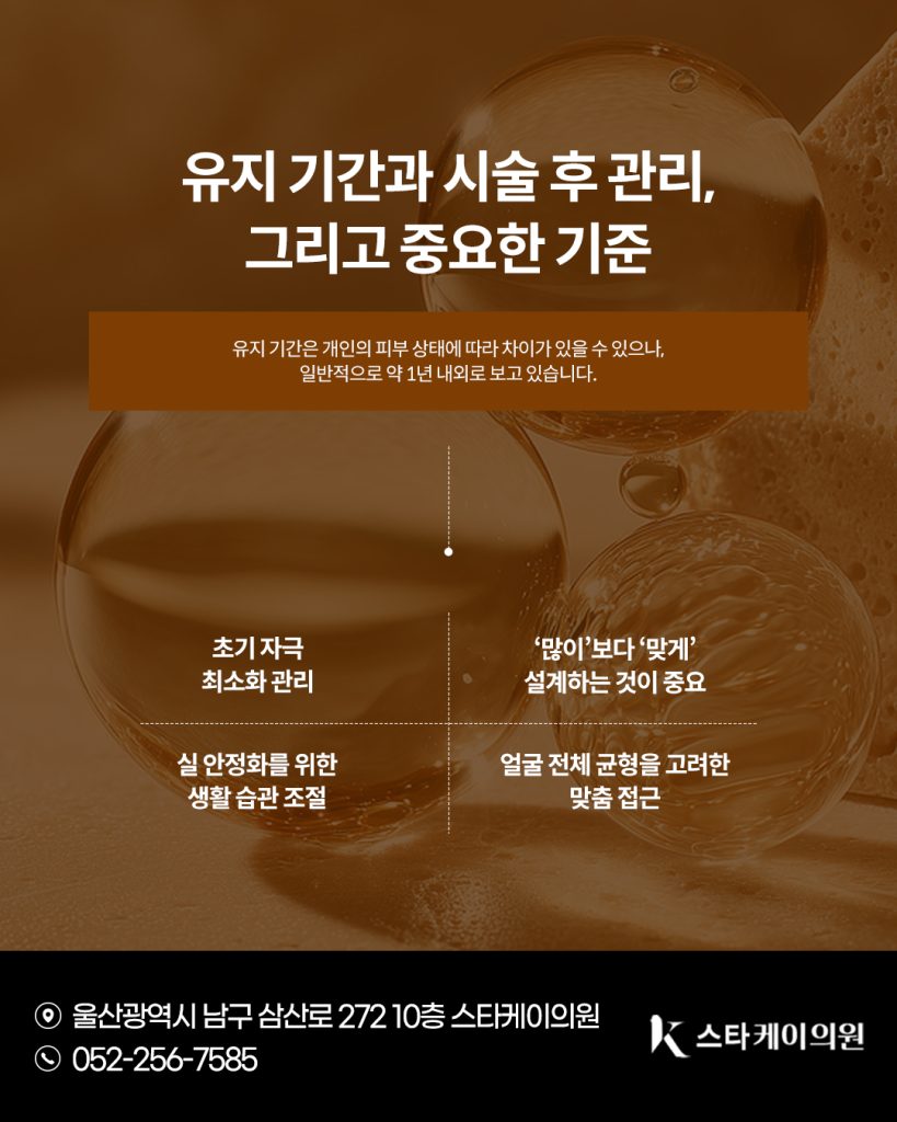 유지 기간은 개인의 피부 상태에 따라 차이가 있을 수 있으나, 일반적으로 약 1년 내외로 보고 있습니다.