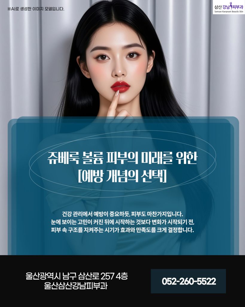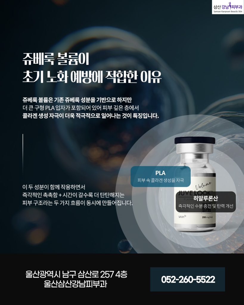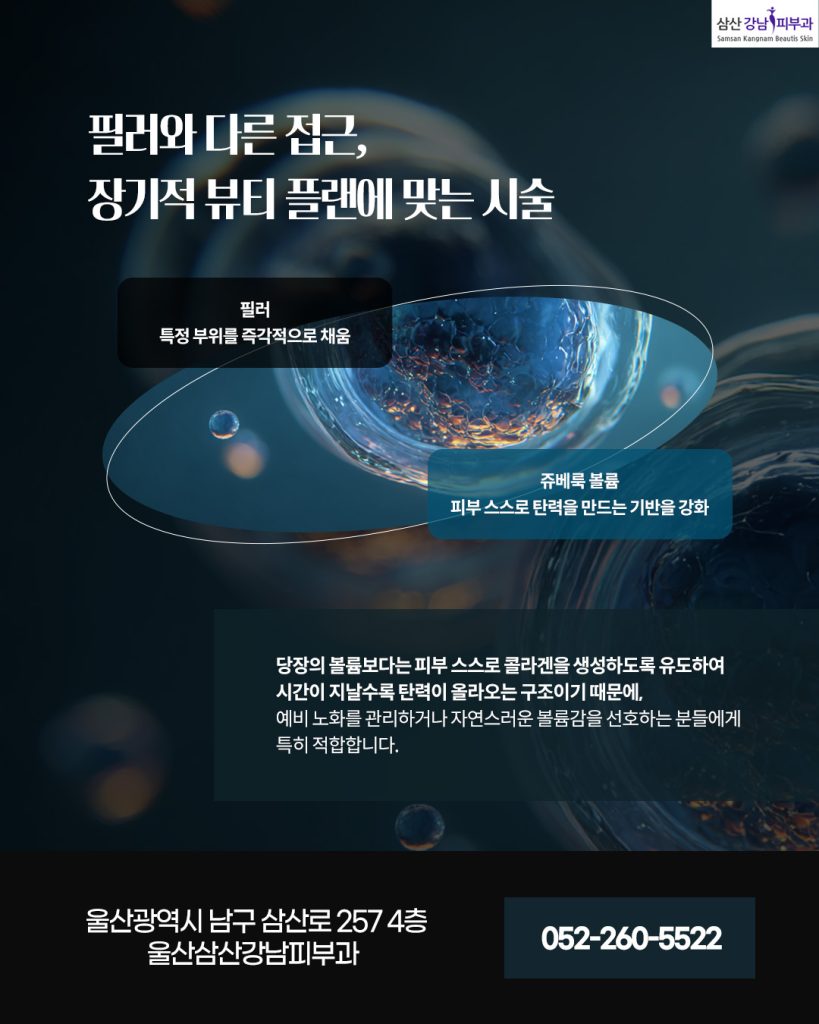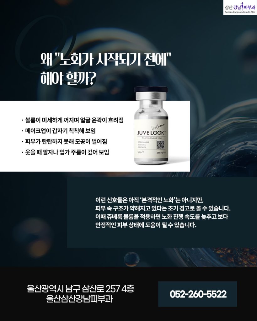피부의 미래를 준비하고 싶거나, 초기에 찾아오는 미세한 변화가 신경 쓰이기 시작했다면 울산삼산강남피부과에서 개인의 피부 상태와 노화 단계에 맞춘 쥬베룩 볼륨 상담을 받아보시기 바랍니다.