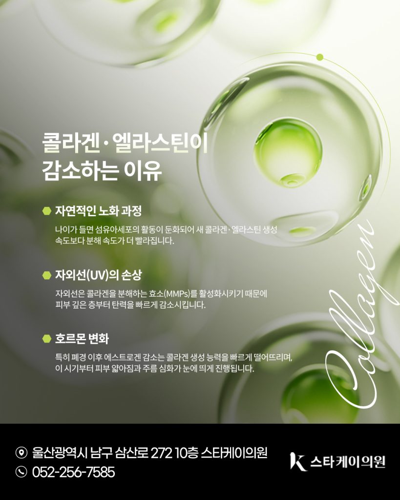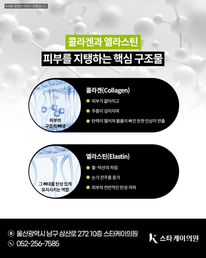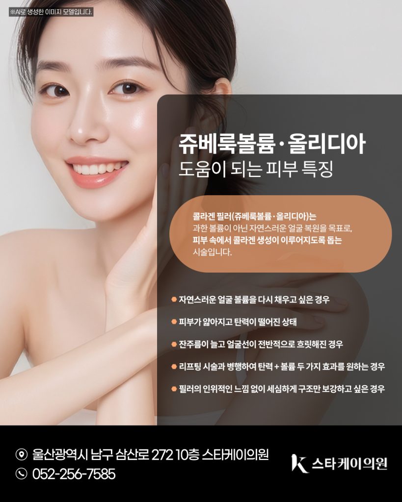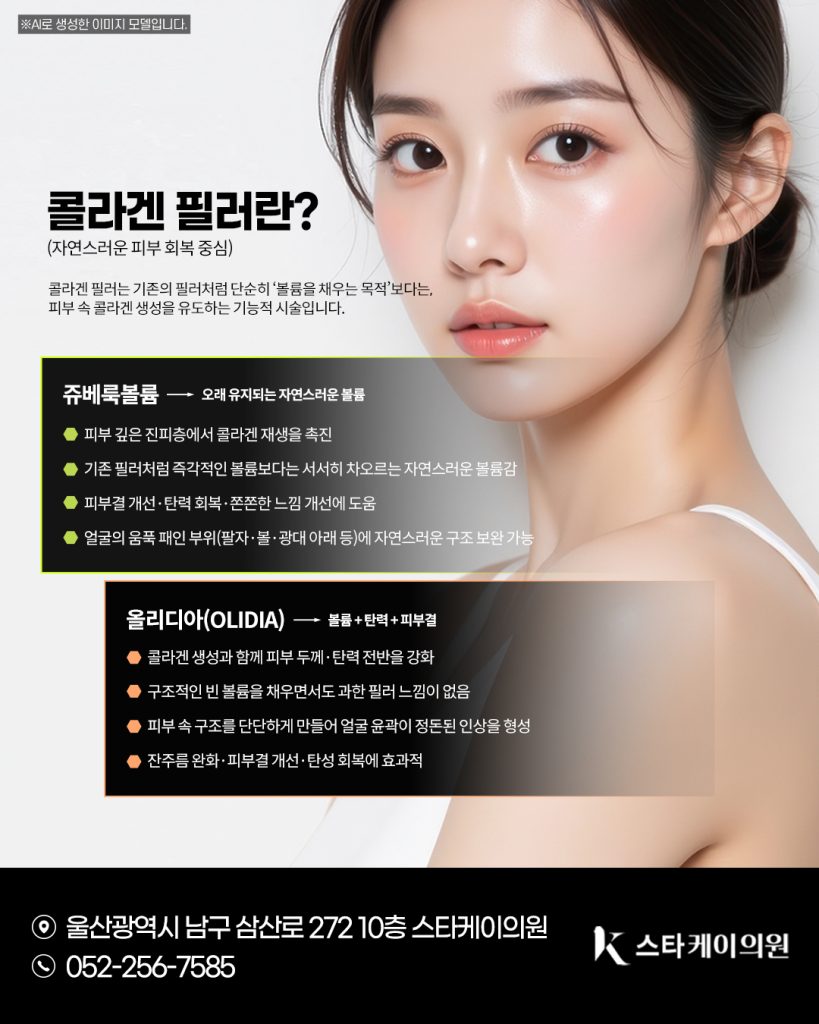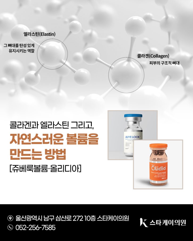 스타케이의원에서는 이러한 피부 구조 변화를 보다 쉽게 이해하실 수 있도록, [콜라겐·엘라스틴의 역할 → 감소 원인 → 감소 시 나타나는 노화 현상 → 개선 방법 → 울산콜라겐필러 종류(쥬베룩볼륨·올리디아) 특징] 이 흐름으로 설명해드리려고 합니다.