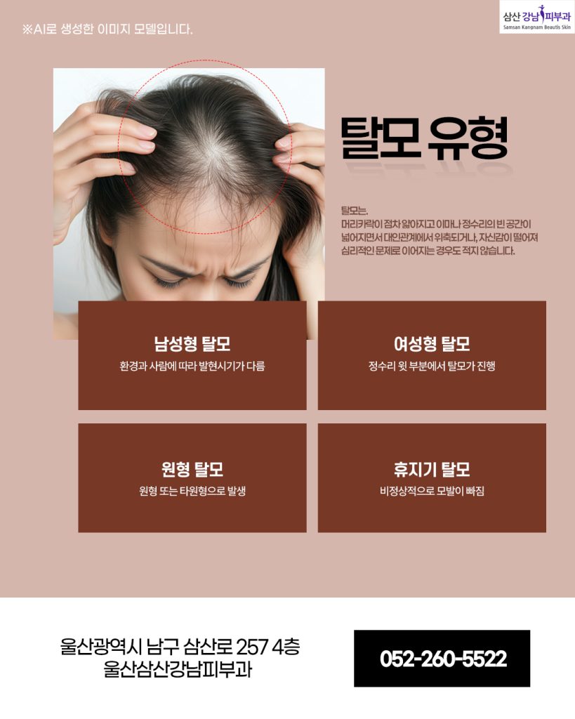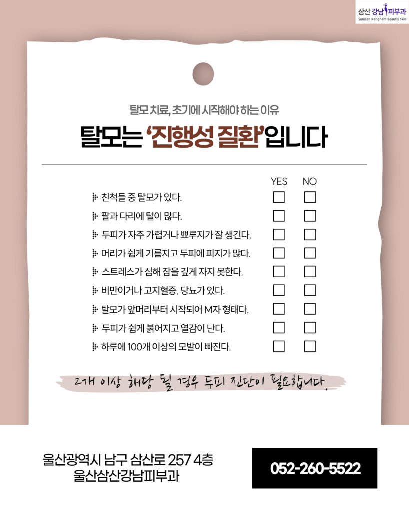탈모는 진행성 질환의 성격을 가집니다. 쉽게 말해, 시간이 지날수록 모발이 가늘어지고 탈락하는 범위가 넓어지는 경향이 있다는 것입니다. 따라서 울산탈모피부과 모발이 완전히 소실되기 전에 모근의 기능을 회복시키고 두피 환경을 개선하는 치료가 필요합니다.