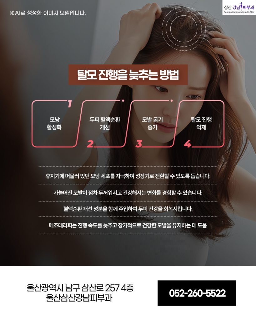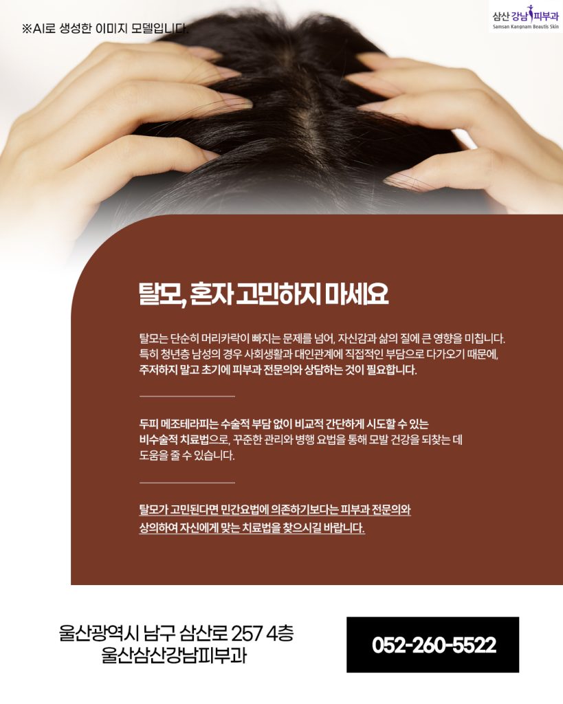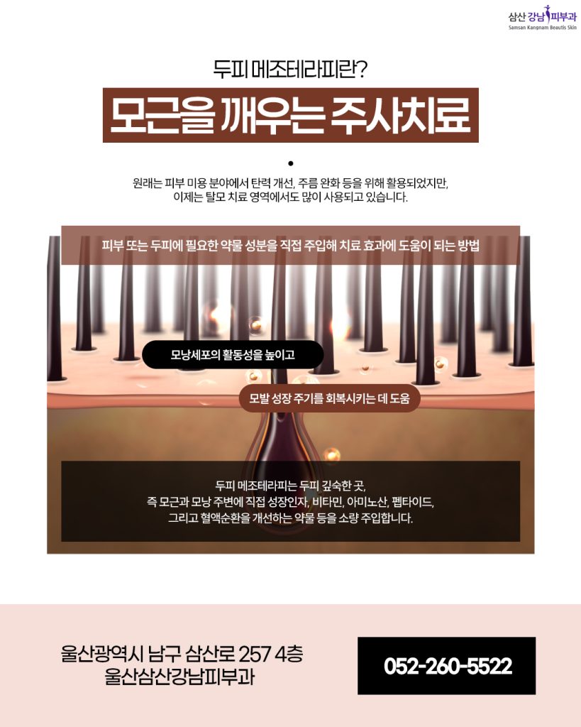 그중 오늘 소개할 ‘두피 메조테라피’는 비수술적 치료로, 탈모 초기나 중등도 단계의 울산탈모피부과 환자들에게 좋은 선택지가 될 수 있습니다.