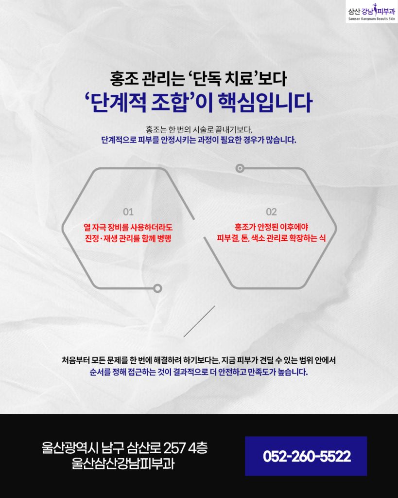👉 홍조가 안정된 이후에야 피부 결, 톤, 색소 관리로 확장하는 방식입니다.