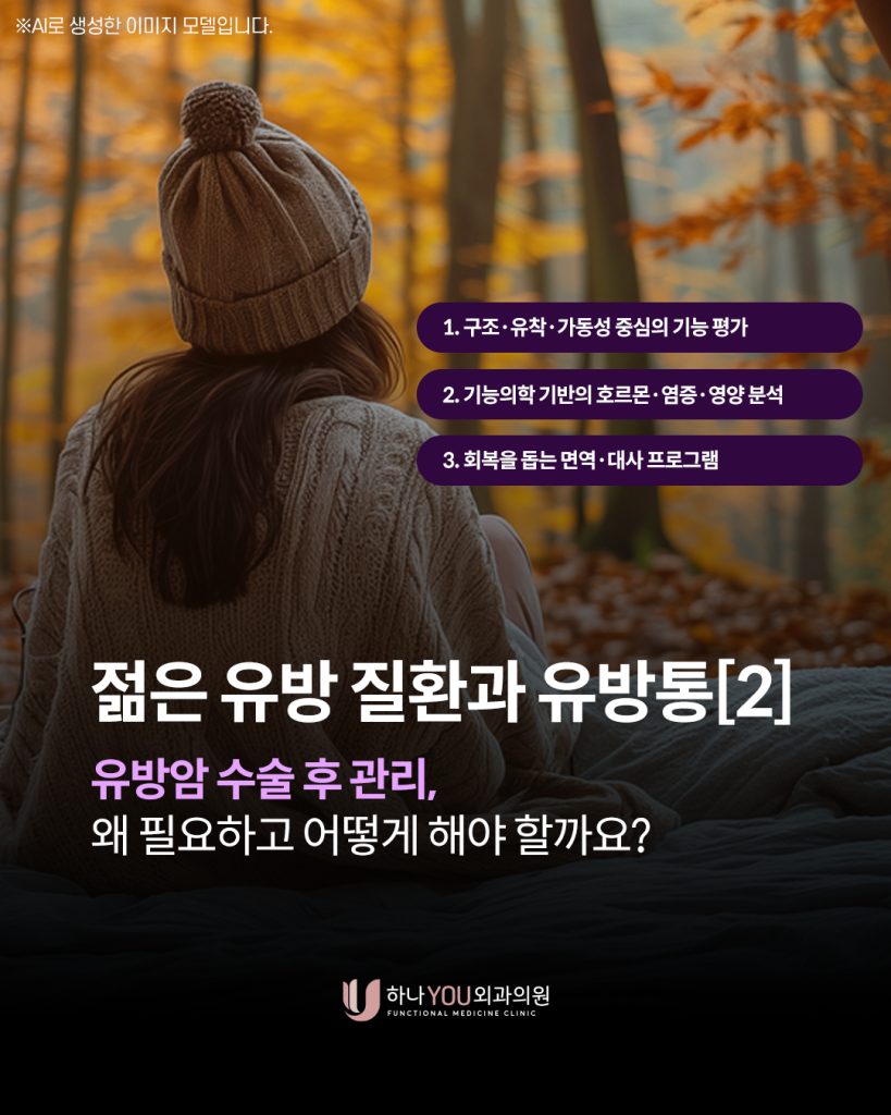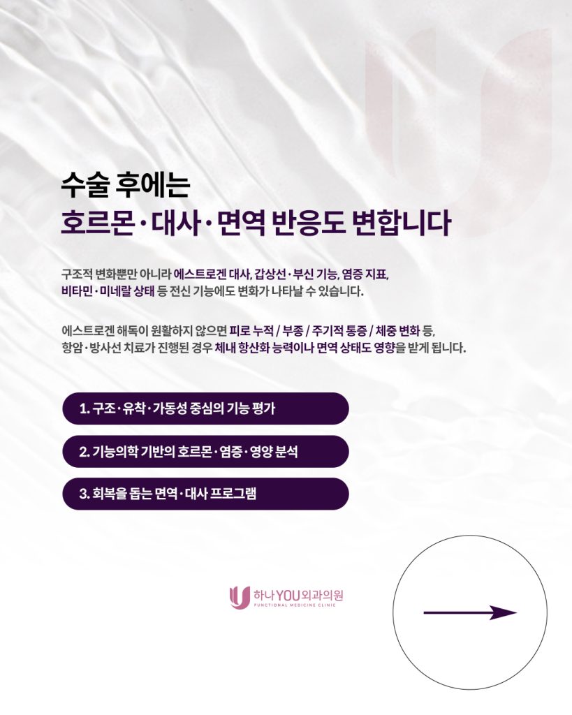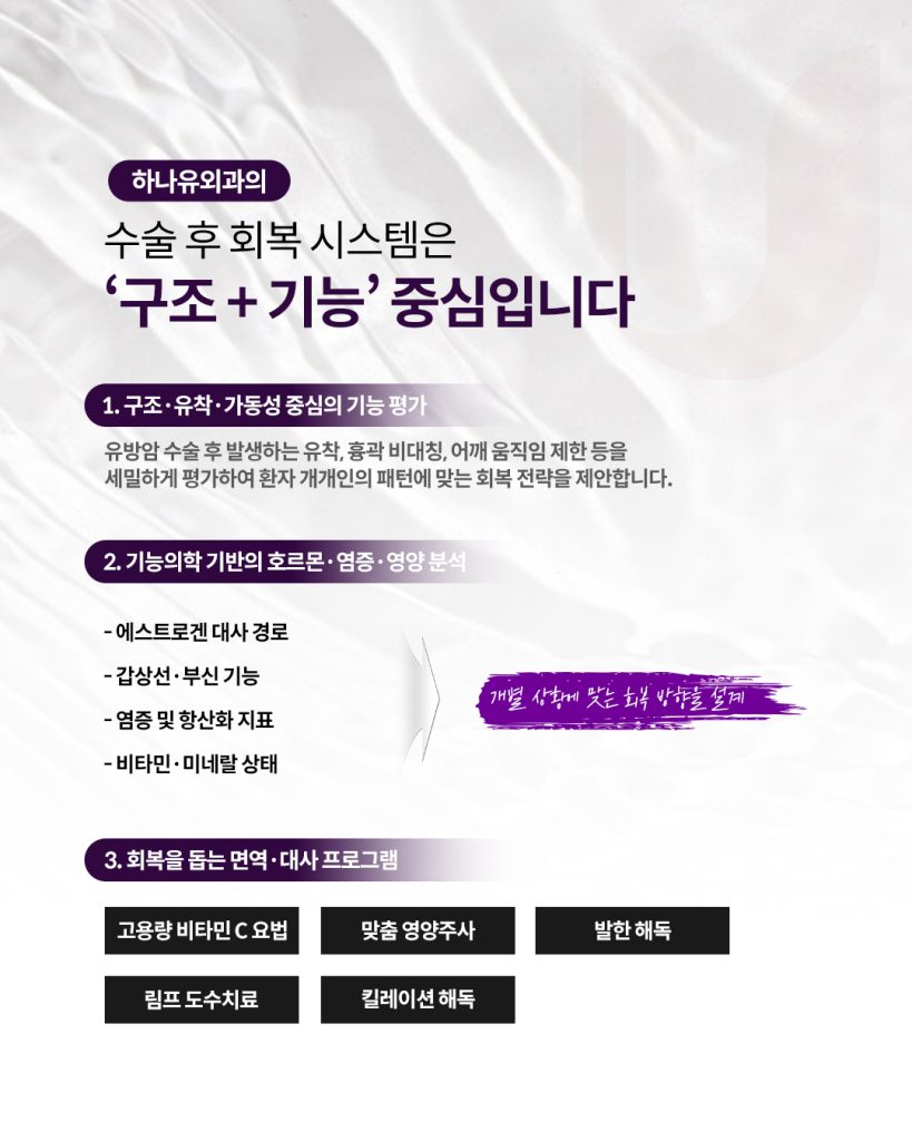 ➡️ 유방암 수술 후에는 구조적 변화뿐 아니라 호르몬·면역·대사 환경이 함께 흔들리기 때문에, 하나유외과에서는 개인의 상태에 따라 고용량 비타민 C 요법, 영양·해독 프로그램, 림프 도수치료 등 다양한 유방암수술후관리 회복 옵션을 제안 드리고 있습니다.