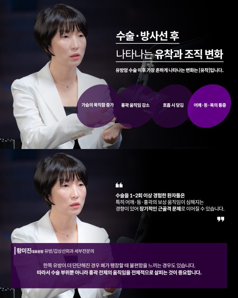 유방암 수술 후 가장 대표적으로 나타나는 변화는 유착으로 수술로 인해 절개된 조직은 자연스럽게 붙어가는 과정이 필요하지만, 그 과정에서 정상적인 움직임을 방해하는 단단한 조직이 생기며, 방사선 치료까지 더해지면 조직 경화가 더 심해질 수 있습니다.