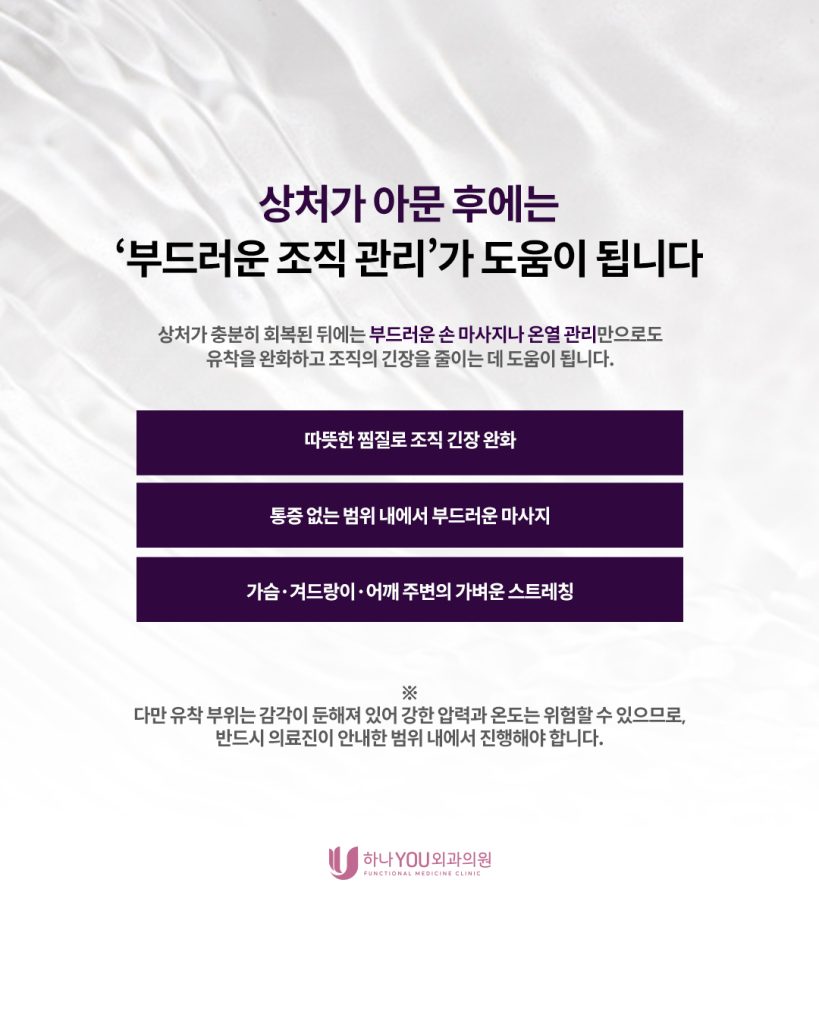 유방암 수술 직후에는 조직이 약하기 때문에 무리한 마사지나 스트레칭은 위험합니다. 상처가 충분히 회복된 이후에는 가볍고 부드러운 손 마사지나 온열 관리만으로도 유착을 완화하고 조직의 긴장을 줄이는 데 도움이 됩니다.