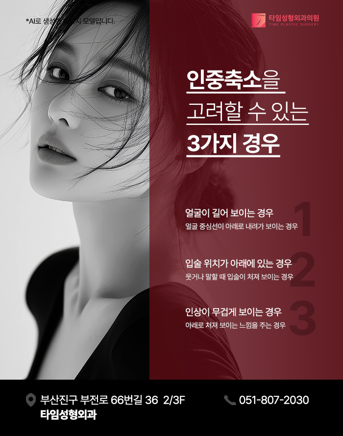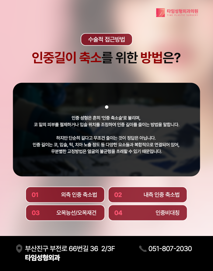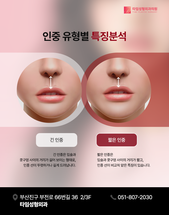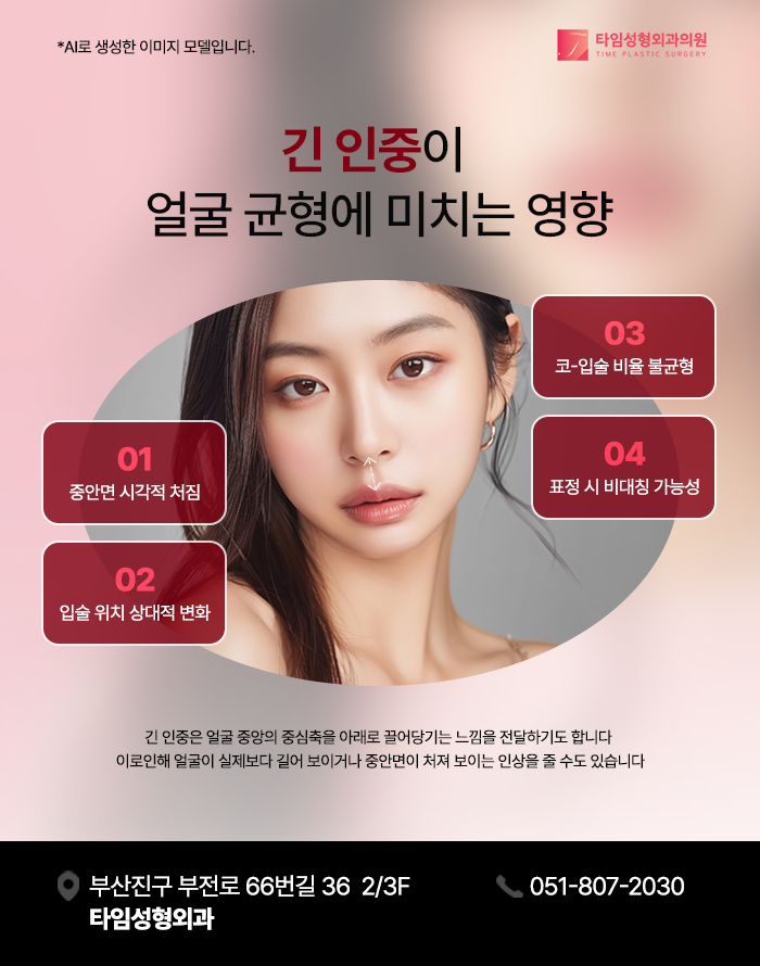 인중은 얼굴의 세로 중심선에서 중요한 위치를 차지하며, 코와 입술 사이의 거리를 의미합니다. 인중의 길이가 과도하게 길거나 비례가 맞지 않을 경우, 전체적인 안면 균형과 비율이 시각적으로 영향을 받게 되며, 얼굴이 길거나 하방으로 늘어진 느낌을 주게 됩니다.