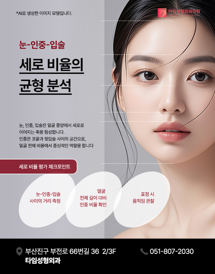 세로 비율을 평가할 때, 가장 먼저 확인해야 할 사항은 눈, 인중, 입술 간 거리입니다.