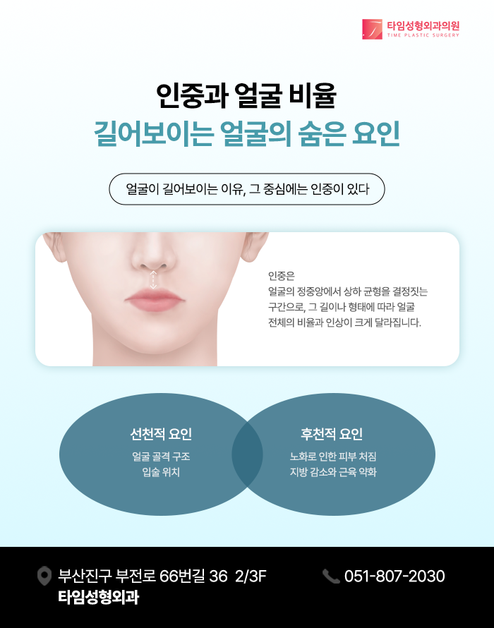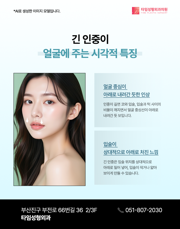 긴 인중은 나이와 연관된 연조직 변화와 상호작용하며 시각적 특징을 강화합니다. 나이가 들면서 피부의 탄력저하, 피하지방층의 감소, 근육의 약화가 진행되면, 인중 길이가 상대적으로 더욱 강조되는 현상이 나타납니다. 특히 반복적인 표정습관과 중력의 영향은 상순을 지지하는 구조물의 약화를 초래하며, 얼굴 중심선이 아래로 이동한 듯한 느낌을 전달할 수 있습니다.
