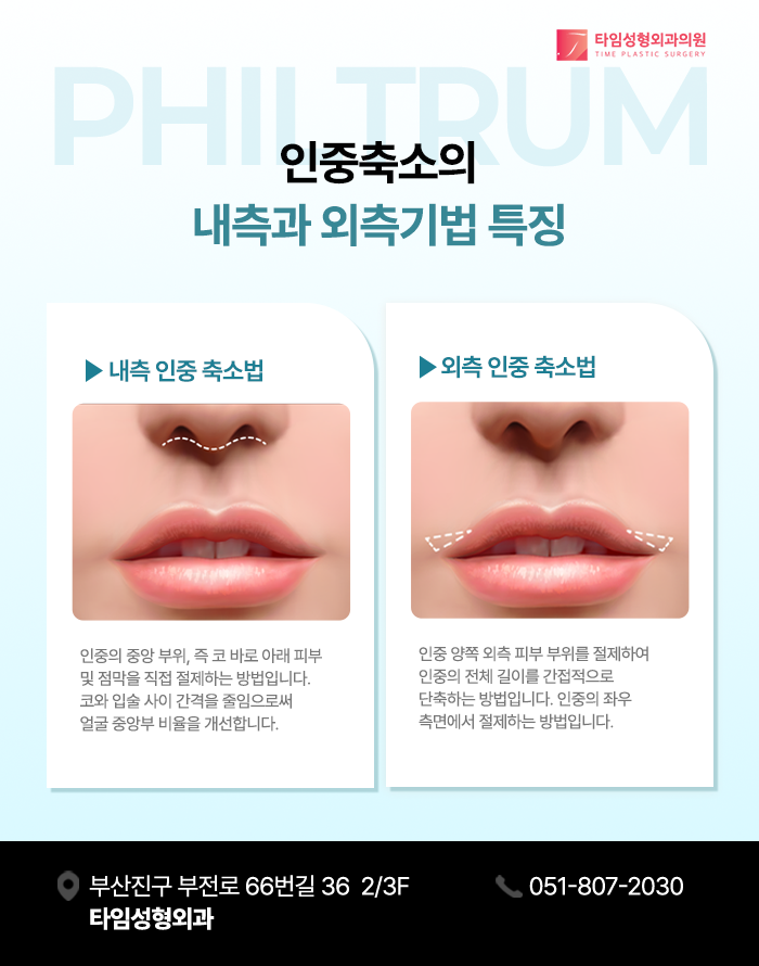 내측 인중축소술은 코끝과 상순의 거리가 과도하게 긴 경우에 적용될 수 있는 방법으로 인중의 중앙부위에 초점을 맞추어 길이를 단축 및 개선하는 수술적 방법을 말합니다. 이 접근은 상순과 코끝 간의 비율을 조정하여 얼굴 중심선이 하방으로 내려간 느낌을 교정하는 방식이며 외측 인중축소술은 인중의 양쪽 끝 부분, 즉 좌우 외측 부위에 변화를 주는 방식을 말합니다.