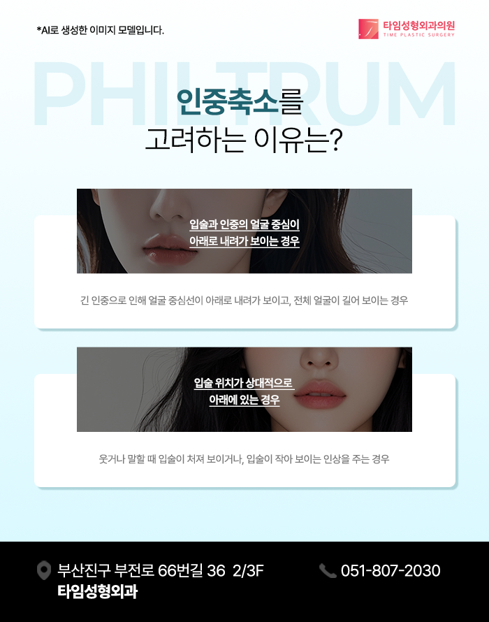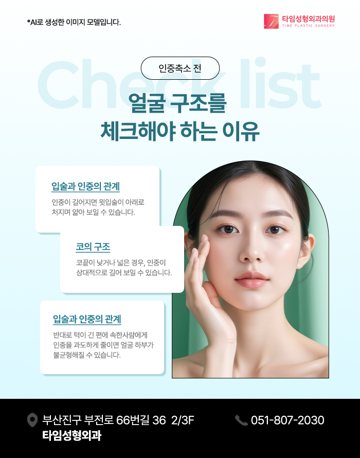 입술과 인중의 상호관계를 고려해야 합니다. 긴 인중은 상순을 하방으로 밀어넣어 웃을 때 입술이 처지거나 평평하게 보이게 합니다. 따라서 입술 두께, 볼륨, 상순의 돌출 정도를 종합적으로 평가해야 합니다. 턱이 길거나 하안면이 발달한 사람의 경우, 인중축소술로 과도하게 줄이면 얼굴 하부가 상대적으로 불균형하게 보일 수 있습니다. 따라서 중안면과 하안면의 비율, 턱선윤곽, 안면길이 등을 종합적으로 검토해보아야 합니다.