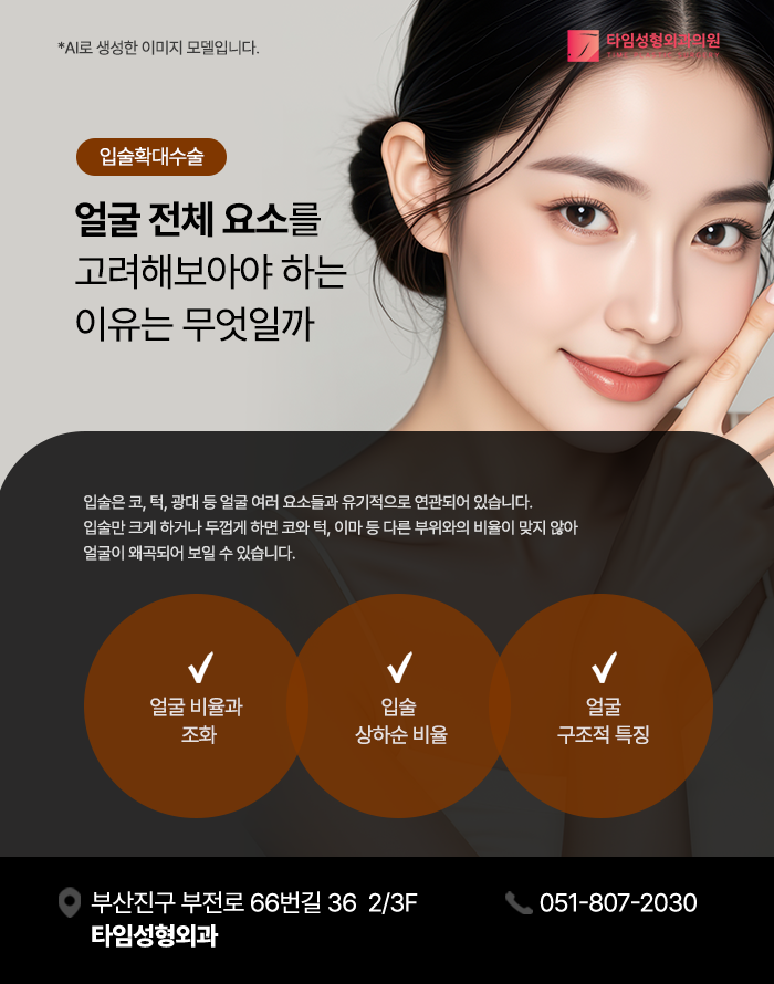 상하순의 두께, 입술 길이, 입술 선의 곡률은 눈, 코, 턱과 같은 주변 구조와 상호작용하면서 시각적 균형을 이룹니다. 상순이 지나치게 도드라지거나 하순 볼륨이 부족한 경우, 단조롭거나 왜곡된 인상을 줄 수 있습니다. 특히 상안면과 하안면의 비율, 구강-턱 거리, 코 끝과 입술 사이 간격 등은 입술 수술을 고려하고 있다면 파악해야 하는 요소이기도 합니다.