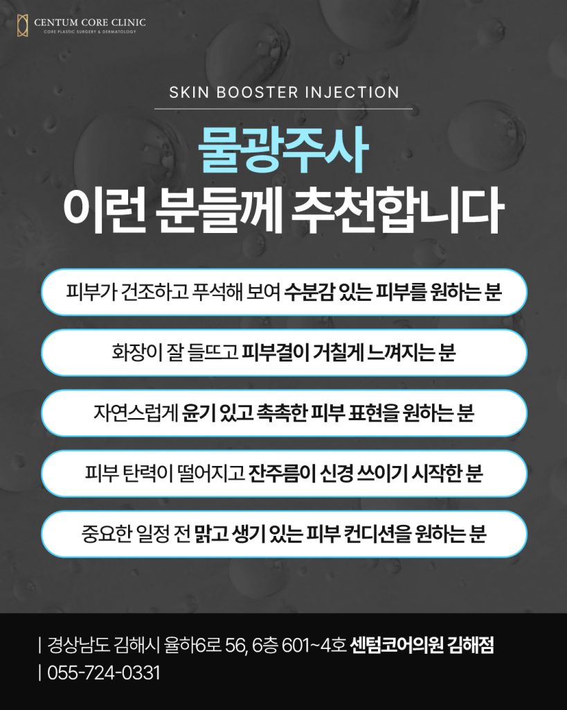 그래서 보습 관리 뿐 아니라 피부 속 환경을 고려한 다양한 피부 관리 방법들이 있지만,그 중 장유물광주사를 찾는 분들 역시 이러한 고민을 해결하기 위한 방법으로 상담을 진행하는 경우가 많으며,촉촉한 광채 피부를 기대하는 경우도 많습니다.