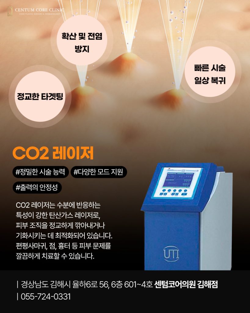 장유편평사마귀제거에서 CO2 레이저는 피부 조직 중 병변에 선택적으로 작용해 정밀하게 제거할 수 있는 장점이 있습니다.