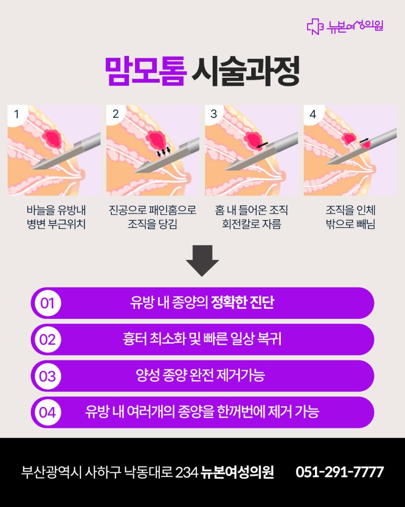 이 때문에 유방에 혹이 발견된 경우 검사와 제거를 동시에 고려하는 분들이 맘모톰을 선택하는 경우가 많습니다.
