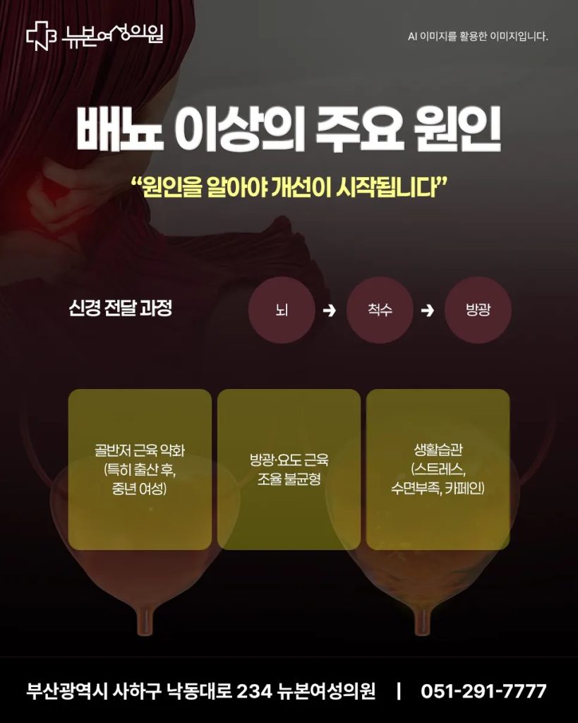 배뇨 이상에는 다양한 원인이 작용합니다. 신경 전달 경로가 예민해지면 실제 소변이 충분하지 않아도 강한 요의를 느낄 수 있습니다. 방광과 요도의 근육 조율이 원활하지 않거나 골반저 근육이 약해지면 저장·배출 기능이 모두 불안정해집니다. 여성의 경우 출산 후 또는 중년 이후 골반저 기능 저하가 흔한 원인입니다. 여기에 스트레스, 수면 부족, 카페인 섭취 같은 생활습관도 증상을 악화시킵니다. 결국 원인을 정확히 파악하는 것이 개선의 첫걸음입니다.