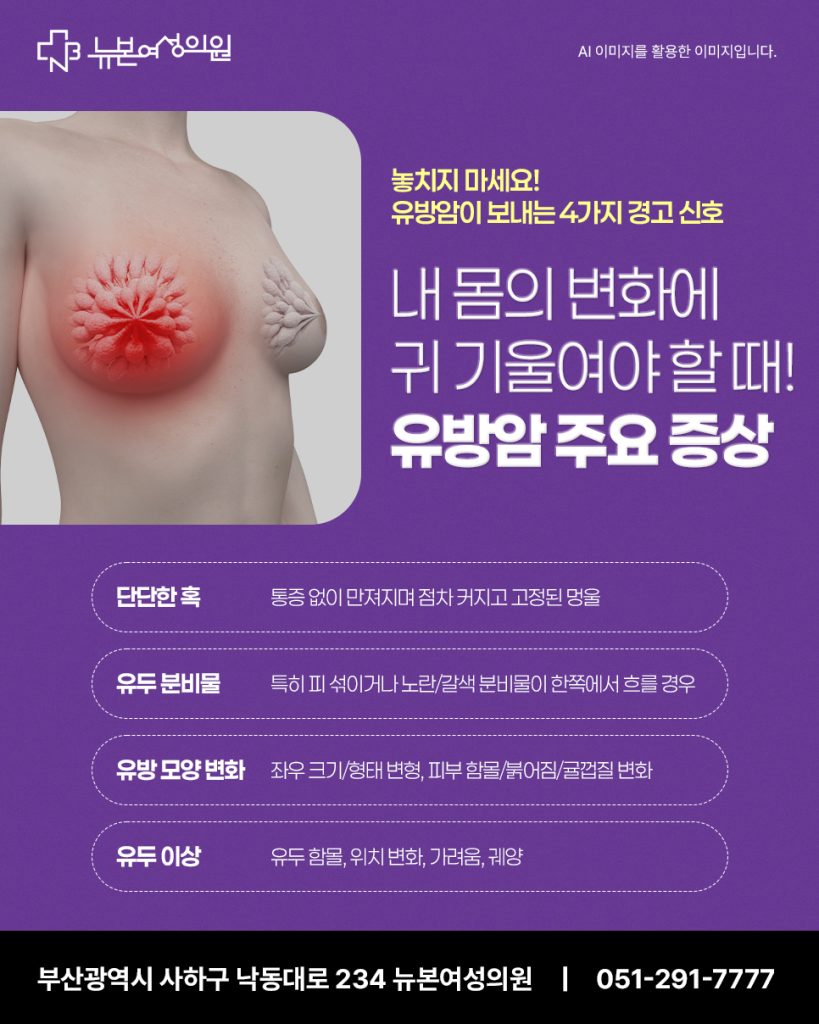 유방암은 유방 조직 내 세포가 비정상적으로 증식하면서 생기는 악성 종양입니다. 다음과 같은 변화가 나타난다면 반드시 병원을 찾아 검사를 받아야 합니다.