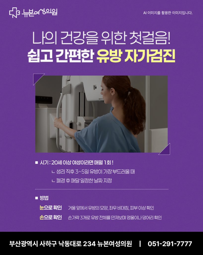 -방법 : 거울 앞에서 유방의 모양, 좌우 대칭, 피부의 이상 여부를 확인하고, 손으로 눌러 혹이나 통증을 체크