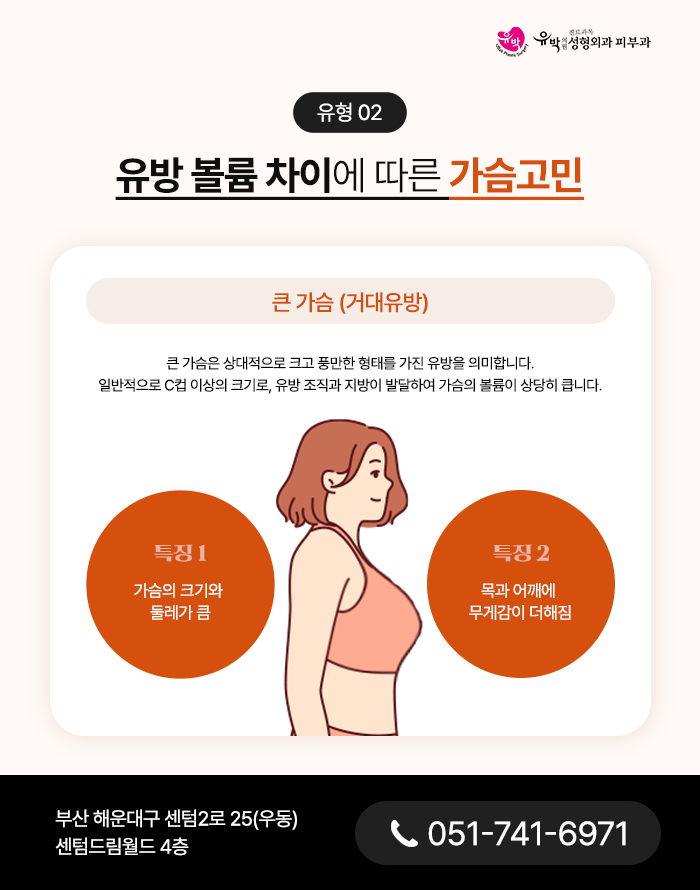 큰 유방은 가슴 자체의 부피와 둘레가 상당히 넓어 전체적인 체형에서 눈에 띄는 비중을 차지합니다.