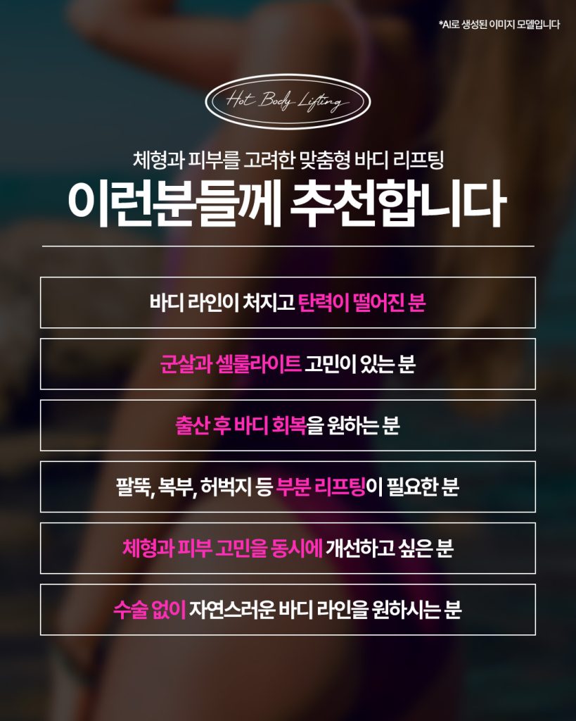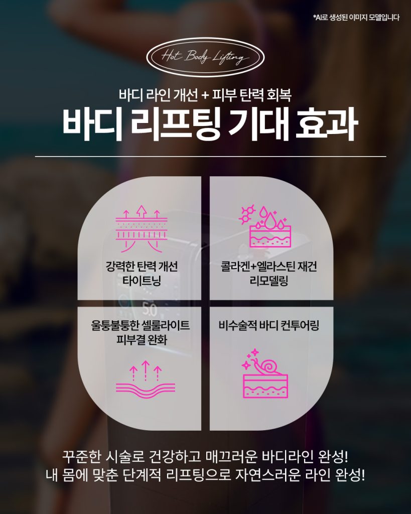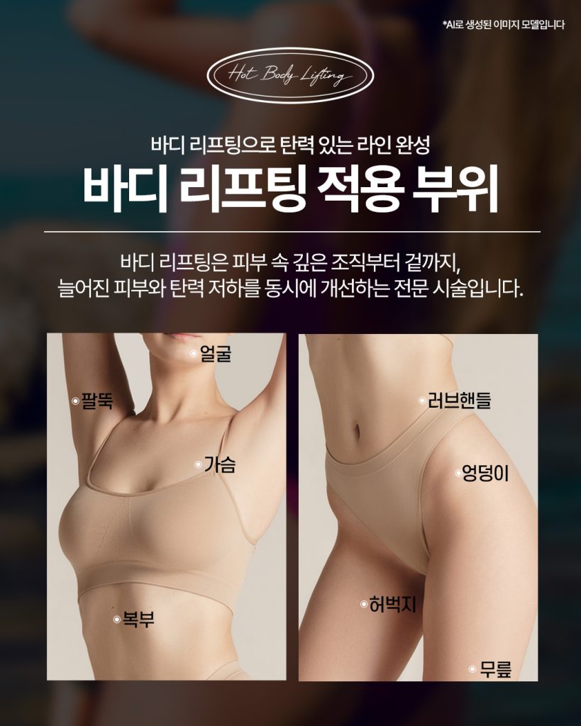 바디리프팅은 몸의 피부 탄력과 라인을 고려하여 진행되는 관리 방법 중 하나입니다.