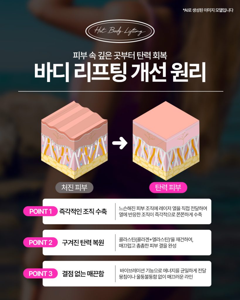 반면 바디리프팅은 피부 속 구조를 고려하여 진피층에 직접 에너지를 전달하는 방식으로 접근하는 관리 방법으로 이야기됩니다.