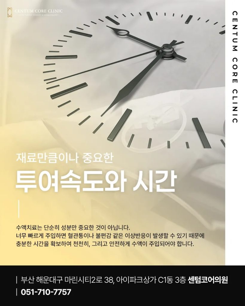 수액치료는 단순히 성분만 중요한 것이 아닙니다. 투여 속도와 시간 역시 매우 중요합니다. 너무 빠르게 주입하면 혈관통이나 불편감 같은 이상반응이 발생할 수 있기 때문입니다. 해운대센텀코어의원에서는 충분한 시간을 확보하여 천천히 안전하게 수액을 주입하고, 치료 중 발생할 수 있는 반응에도 즉시 대응할 수 있도록 관리하고 있습니다.