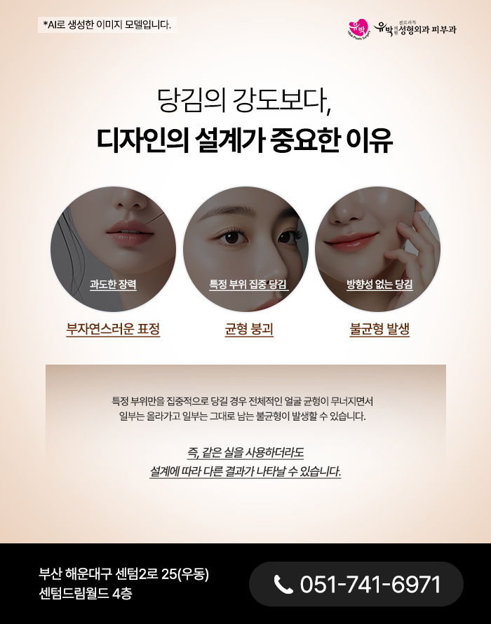 이러한 특성을 고려하지 않은 채 단순히 강한 힘으로 조직을 끌어올릴 경우 특정 부위는 과도하게 긴장되고 다른 부위는 상대적으로 움직임이 제한되면서 전체적인 표정 균형이 무너질 수 있습니다.