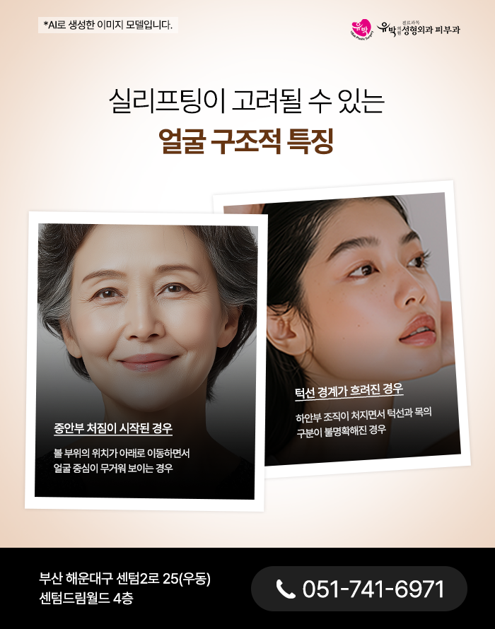 하지만 이 처짐은 단순히 피부가 늘어나는 현상이라기보다는, 내부 조직이 아래 방향으로 이동하면서 발생하는 구조적 변화에 가깝습니다. 이러한 복합적인 변화는 얼굴의 특정 부위에 국한되지 않고 전체적인 인상에 영향을 미치게 됩니다.