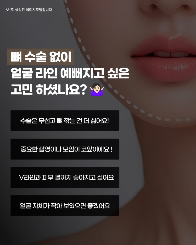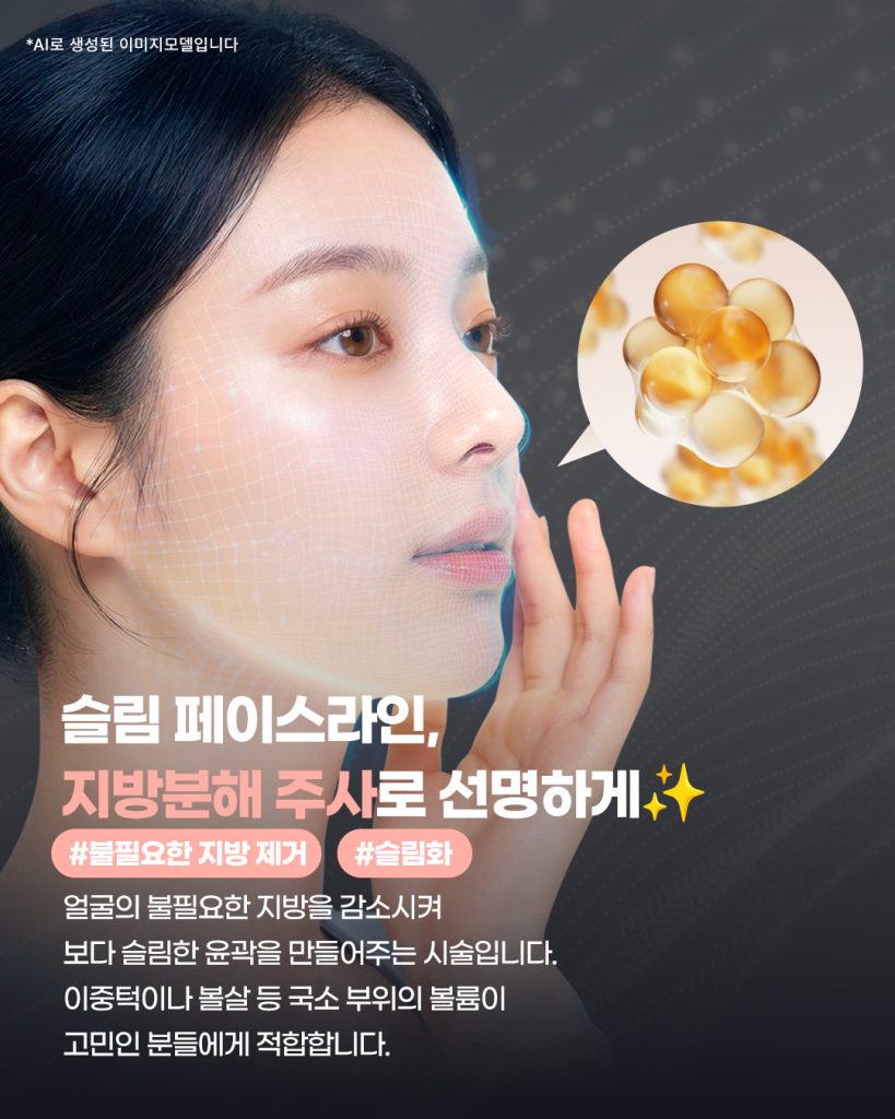 불필요한 지방이 집중된 부위를 분해해 얼굴 라인을 깔끔하게 정리하는 효과가 있습니다.