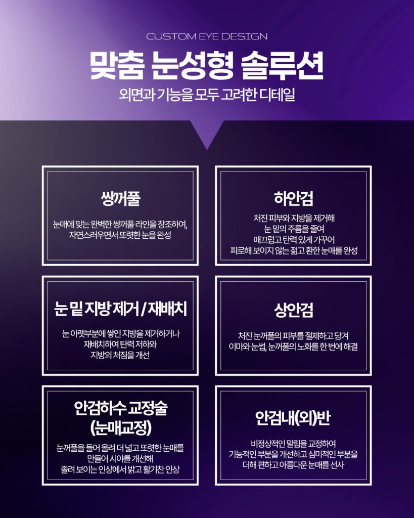 단순히 한 가지 방법이 아닌 눈꺼풀 처짐,지방 상태,피부 탄력 등을 종합적으로 고려해야 합니다.