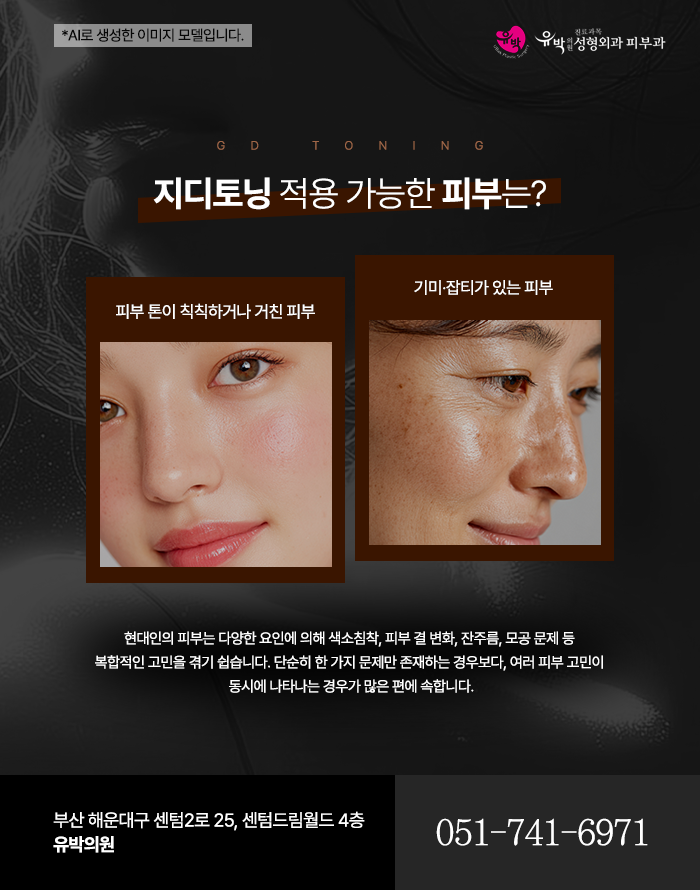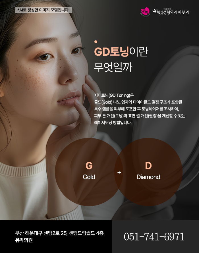 피부 톤의 불균형, 미세한 표면 결 요철, 반복적인 색소 침착으로 인한 잔여 잡티 등은 매일하는 홈루틴으로만 개선하기 어려울 수도 있습니다. 지디토닝이란 초소형 블랙다이아몬드와 골드미립자가 함유된 용액을 피부에 도포한 후, 토닝레이저를 이용하여 피부를 개선하는 방식을 말합니다.