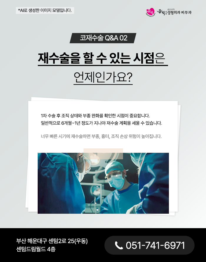 해운대코재수술의 시점을 잘못 선택하면 조직손상, 부종지속, 흉터 유착 등으로 인해 최종 결과에 영향을 미칠 수 있습니다.