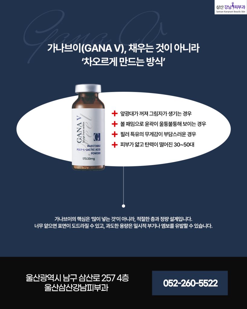 가나브이의 핵심은 많이 넣는 것이 아니라 적절한 층과 정량 설계입니다. 너무 얕으면 표면이 도드라질 수 있고 과도한 용량은 일시적 부기나 엠보를 유발할 수 있습니다.