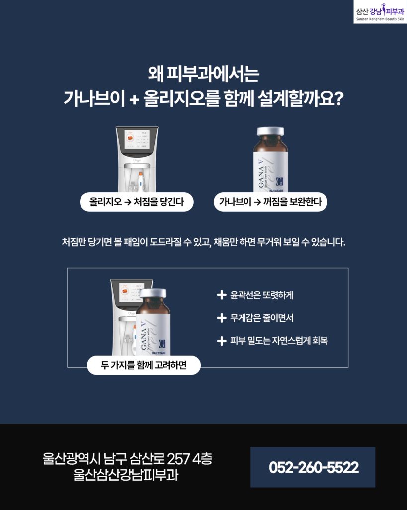 그렇지만 가나브이와 올리지오는 서로를 대체하는 시술이 아닙니다. 각자의 역할이 분명히 다르기 때문에 적절히 조합될 때 시너지 효과가 나타납니다. 처짐과 꺼짐은 다른 문제입니다.