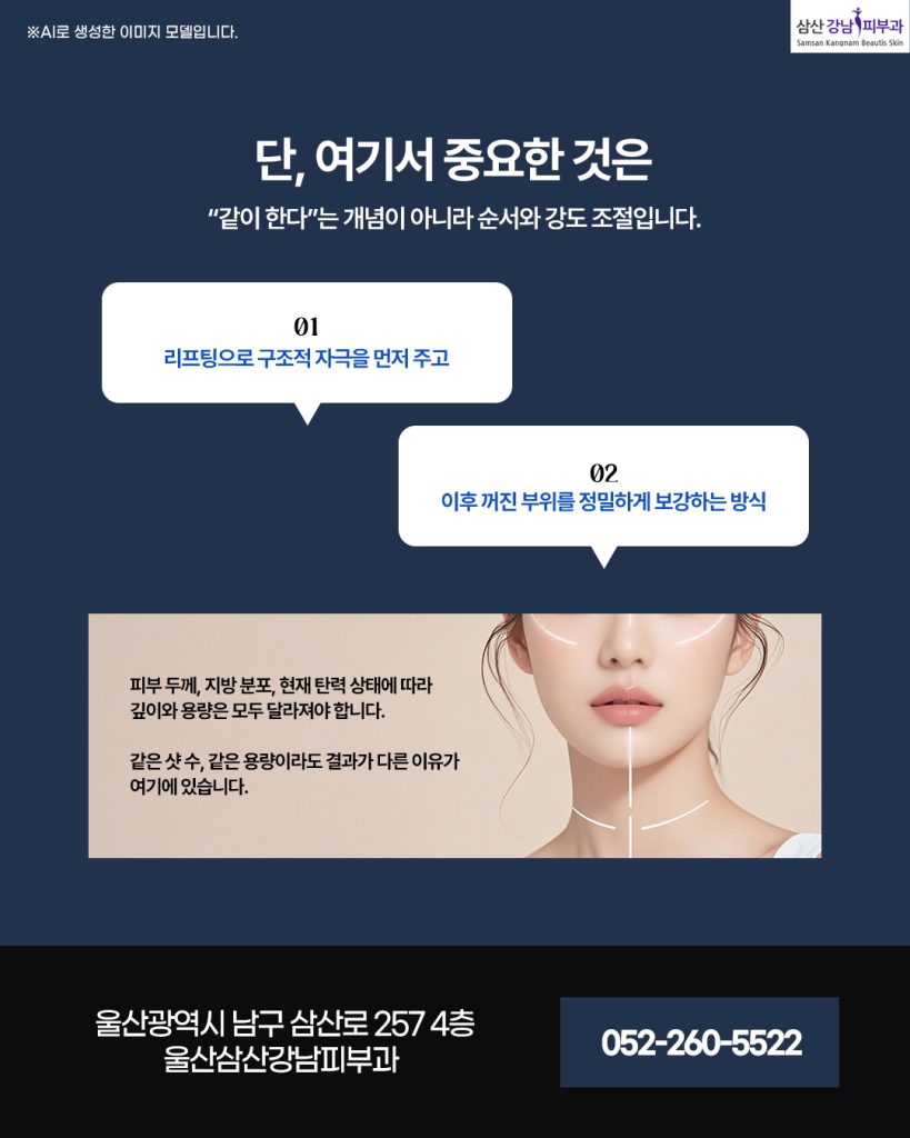 피부 두께, 지방 분포, 현재 탄력 상태에 따라 깊이와 용량은 모두 달라져야 합니다. 같은 울산삼산동리프팅 샷 수, 같은 용량이라도 결과가 다른 이유가 여기에 있습니다.