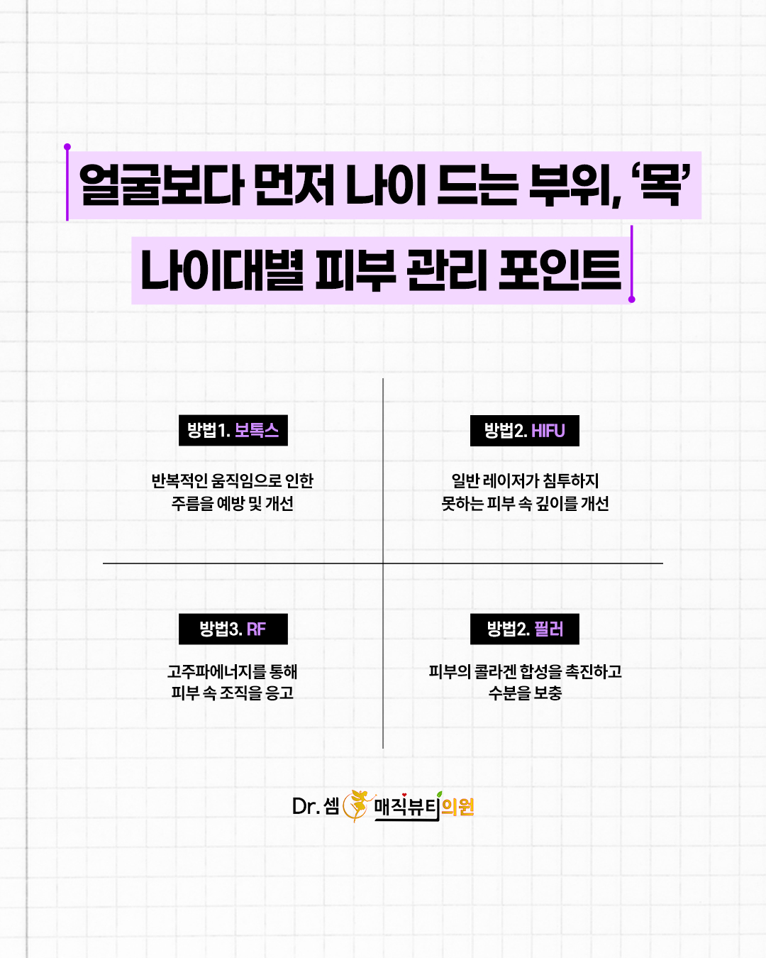 목은 얼굴보다 더 빠르게 나이를 드러내는 부위입니다.표정 변화가 잦은 얼굴에 비해 관리가 소홀하기 쉽고, 자외선 차단이나 보습 관리도 상재거으로 부족하기 때문입니다. 특히 얇은...
